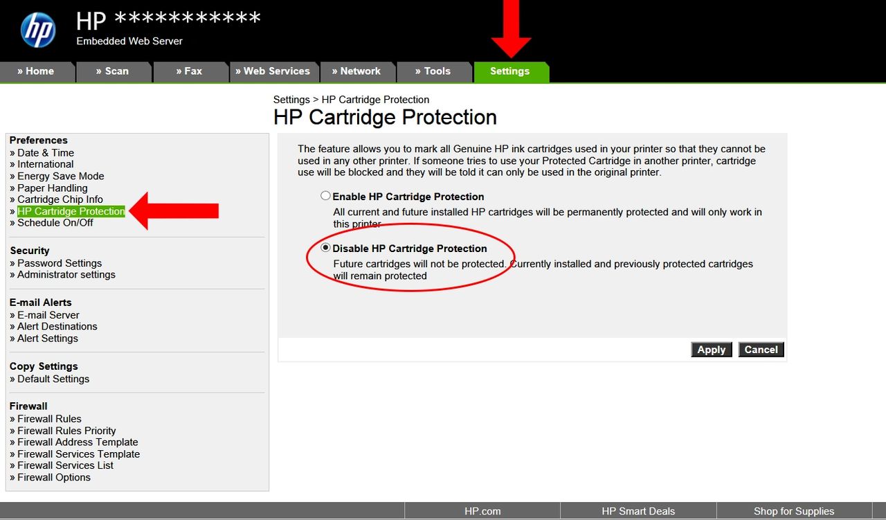 Depending on your software application this option might be called Printer Properties Options Printer Setup Printer or Preferences. Click on Settings and select HP Cartridge Protection on the lafthandside Click on Disable HP Cartridge Protection. Open a Web browser and enter your printers IP address in the. Plug the power cord back in and power on the printer. Click the tab for Cartridge protection. Place the incompatible ink cartridge back in the printer. If yours is a network connected printer then you need to copy and paste the IP of your printer in the browser to visit the software panel. HP is back at it again with their mission to stop letting consumers choose what type of cartridges they want to install and use in their printer.